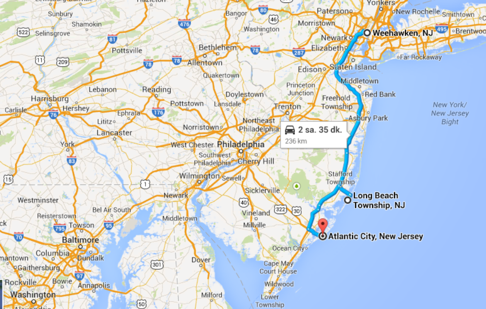 New Jersey'den arabamızı kiraladık ve "Atlantic City" e doğru yola koyulduk. Araba ile, NewYork Atlantic City arası yaklaşık iki saat sürüyor.